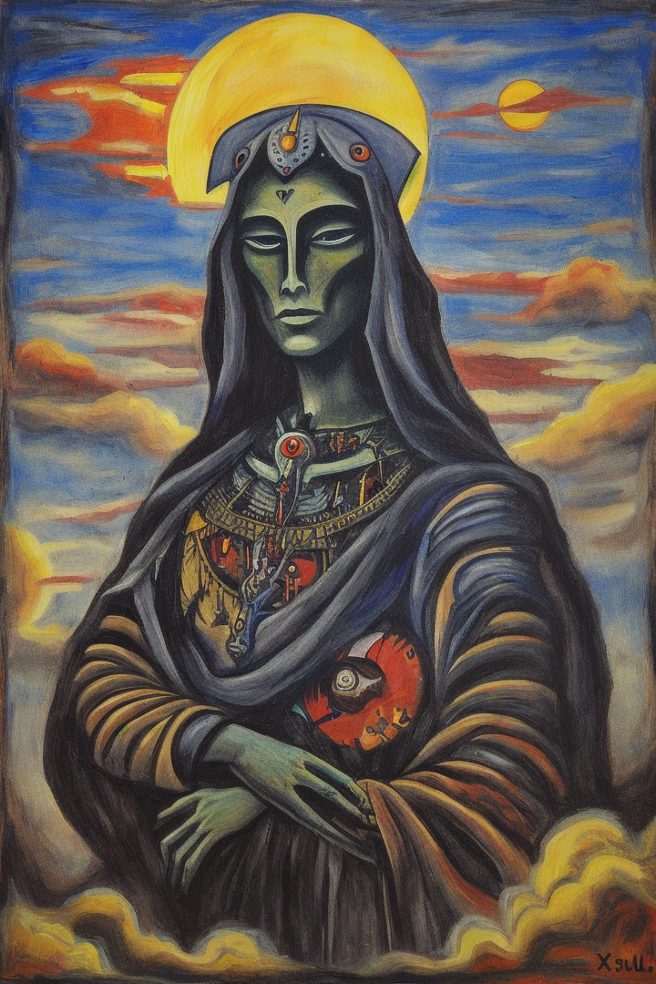 “xul solar, painting, no humans, traditional media, creature, surreal, abstract, sun, zodiac, parody, clouds, sky”