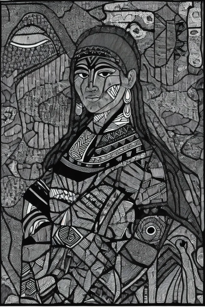 “diseño, indigena, argentino, cienaga monochrome, comic, greyscale, no humans, black background, black border”