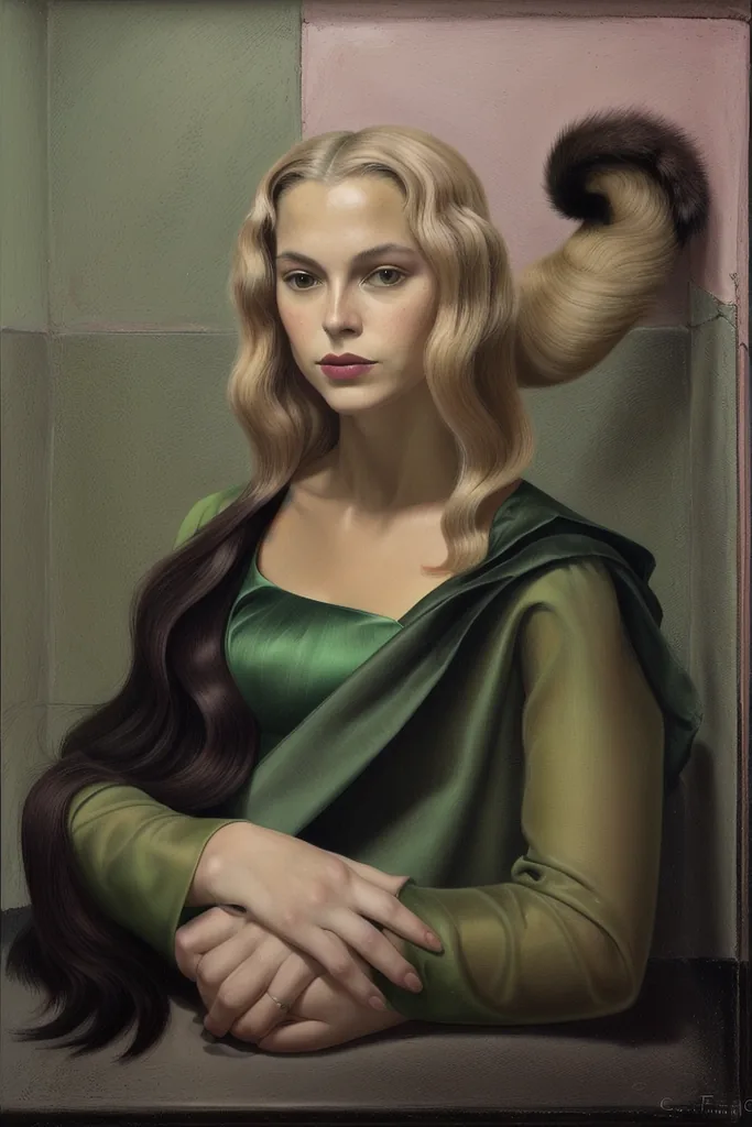 “surrealist portrait of blonde female chimera by fini (sfumato) (claroscuro), perspective,green, pink, colorful, chimera, catwoman, furry, water, sexy, curly hair”