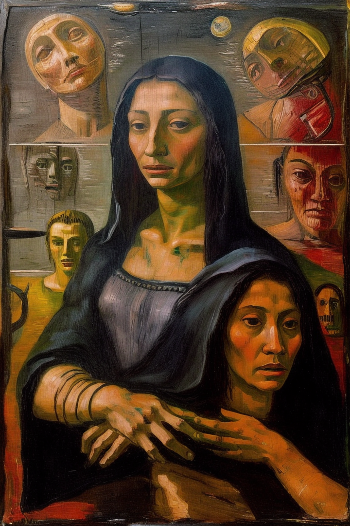 “surreal abstract portrait of la gioconda, crucified, hell, horror, forner, hellish landscape, blood, colorful”