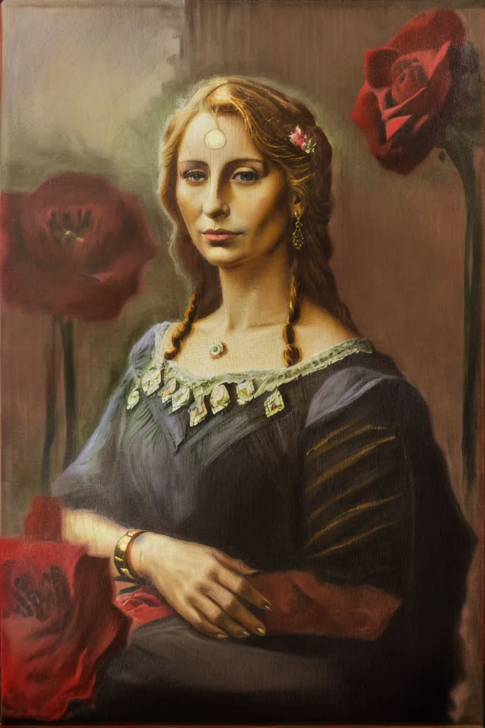 “colorful painting of a blonde gioconda, oil on canvas, red, white, garden background, grass, outdoors, roses, lilies, de la carcova”