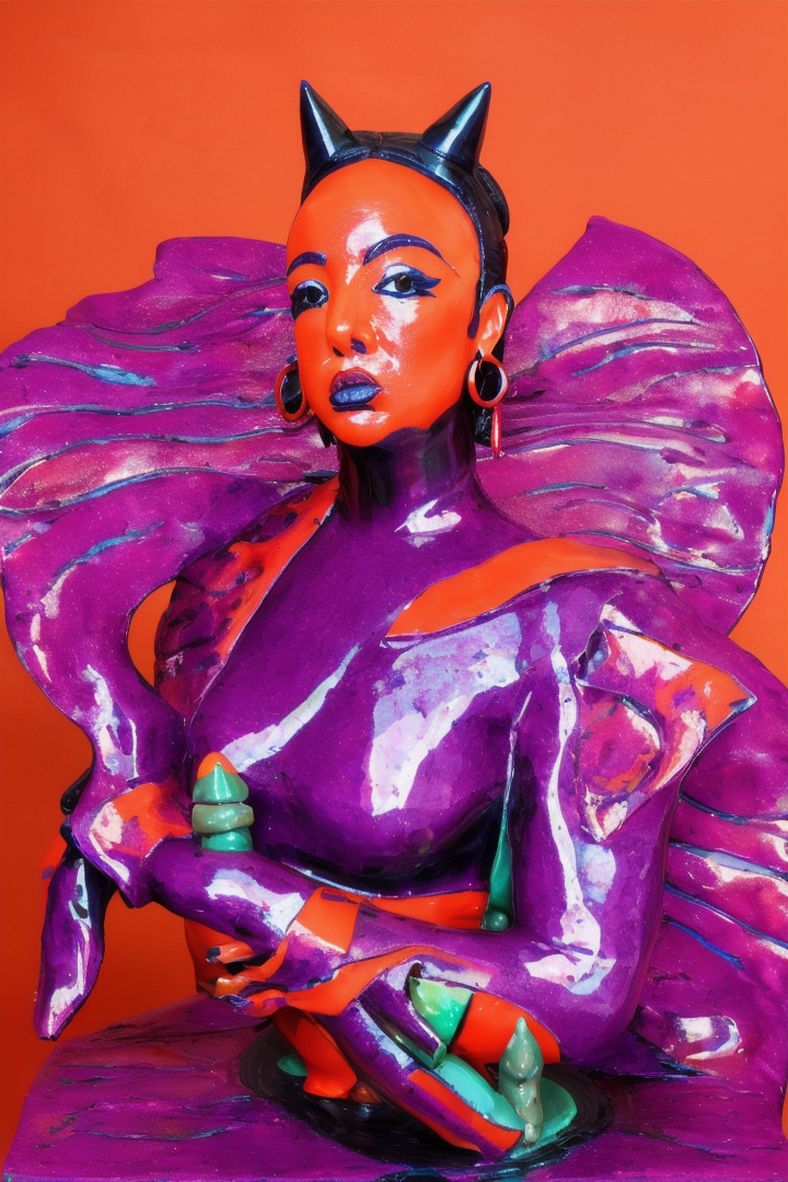 “(noma),(sculpture),a woman,sexy,lipstick,colorful,(photograph of a ceramic sculpture) on orange and purple,expressive,nsfw,”