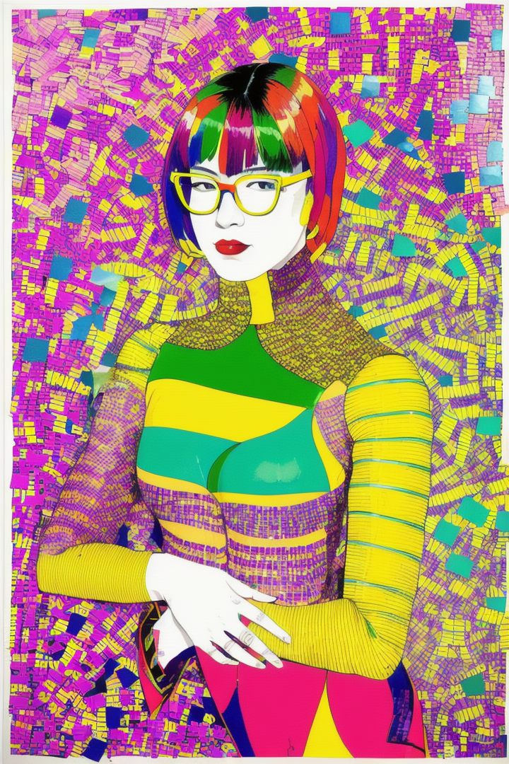 “(minujin), (popart), artwork, colorfull, (confetti stripped), yellow, purple, green, orange, portrait of a woman in a bright catsuit and glasses, white background”