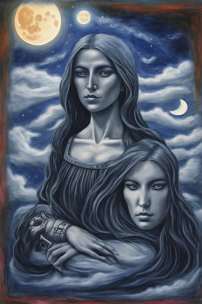 “xul solar, no humans, woman, surreal, abstract, moon, zodiac, parody, clouds”