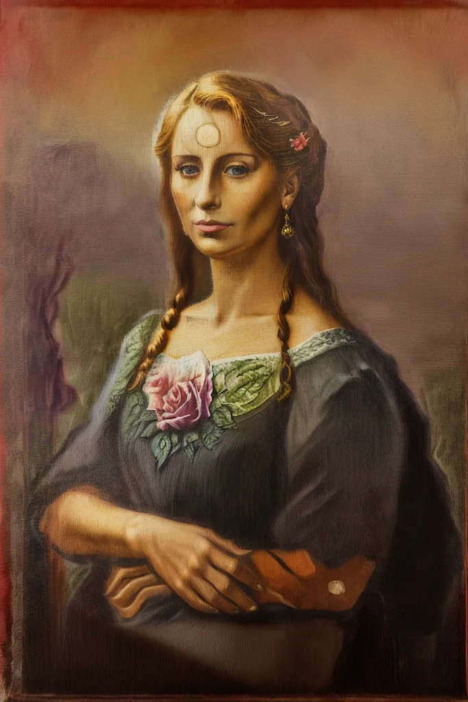 “colorful painting of a blonde gioconda, oil on canvas, red, white, garden background, grass, outdoors, roses, lilies, de la carcova”