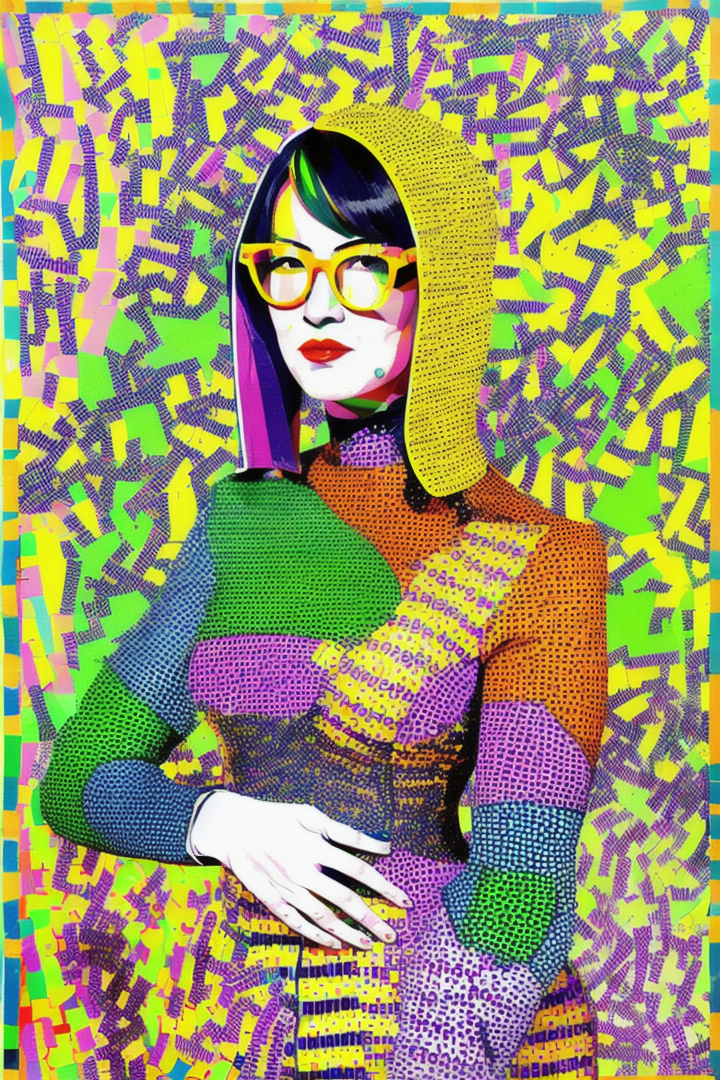 “(minujin), (popart), artwork, colorfull, (confetti stripped), yellow, purple, green, orange, portrait of a woman in a bright catsuit and glasses, white background”