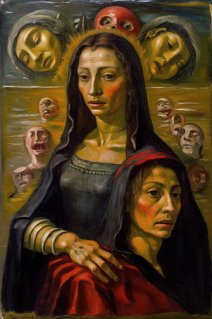 “surreal abstract portrait of la gioconda, crucified, hell, horror, forner, hellish landscape, blood, colorful”