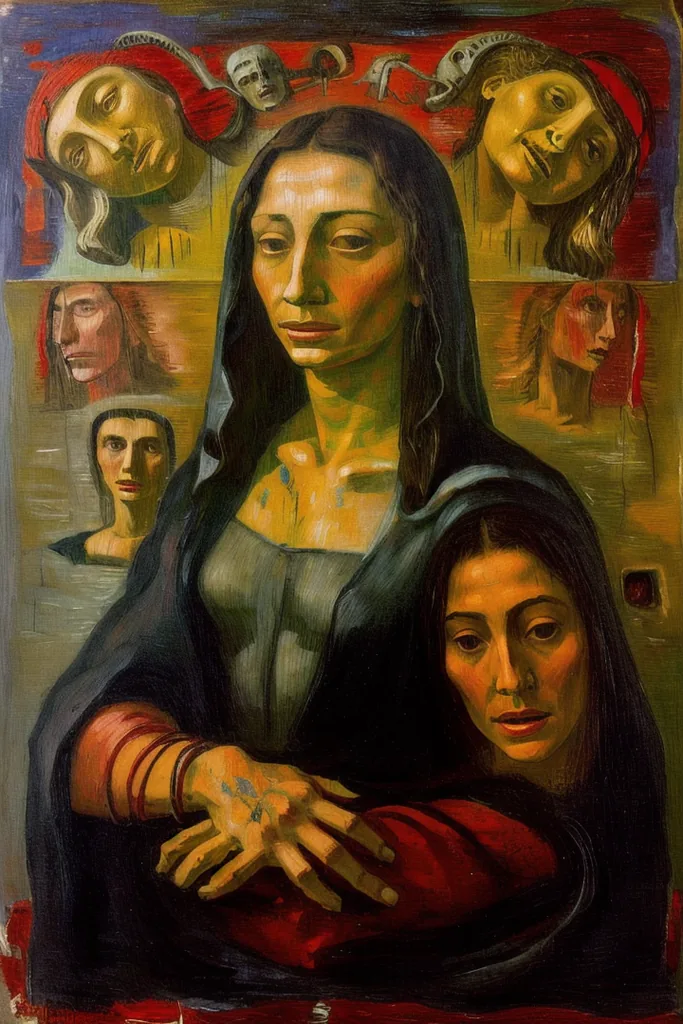“surreal abstract portrait of la gioconda, crucified, hell, horror, forner, hellish landscape, blood, colorful”