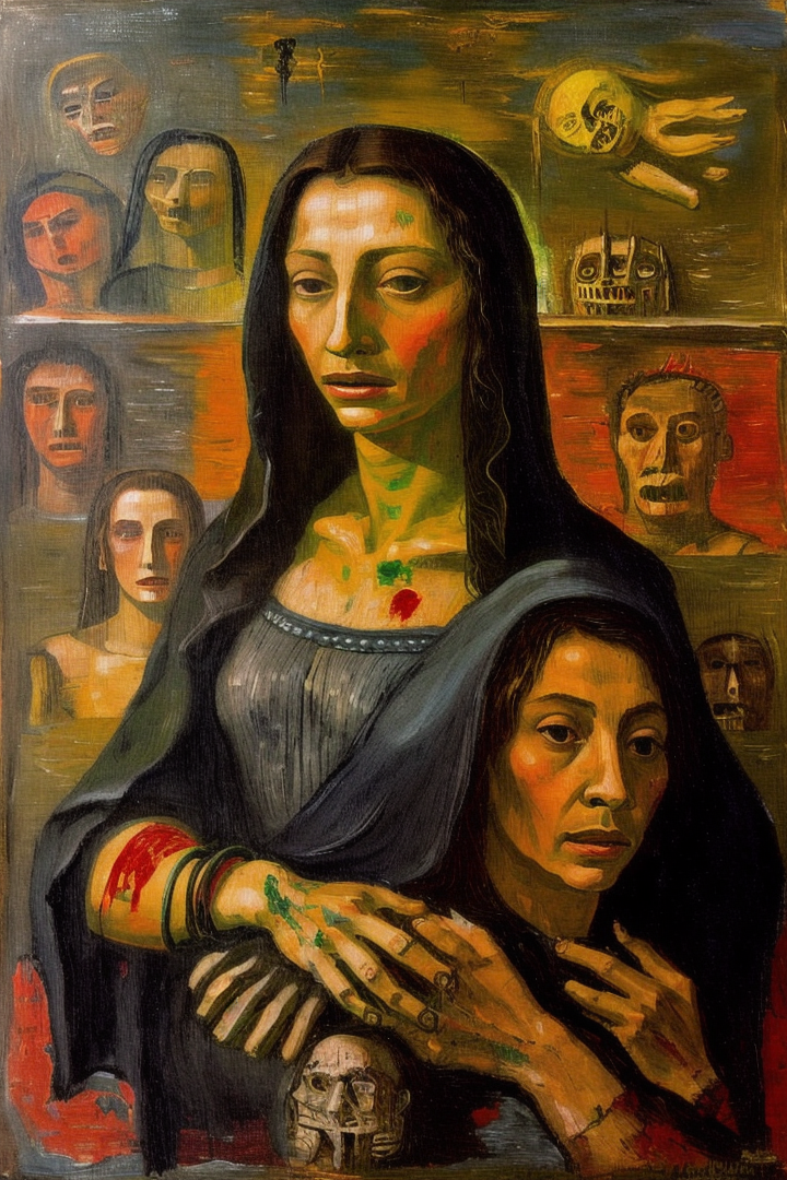 “surreal abstract portrait of la gioconda, crucified, hell, horror, forner, hellish landscape, blood, colorful”