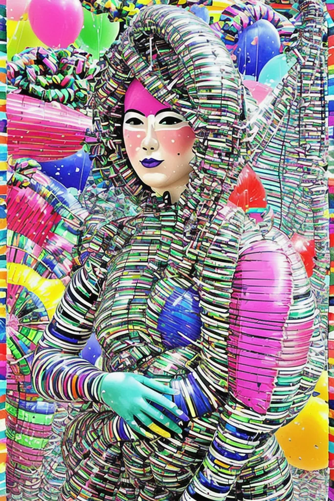 “(minujin), (popart), artwork, colorfull, (confetti stripped), balloon instalation, stripped, colorful, woman balloon sculpture, a colorful inflatable slide in a yard, city park background”