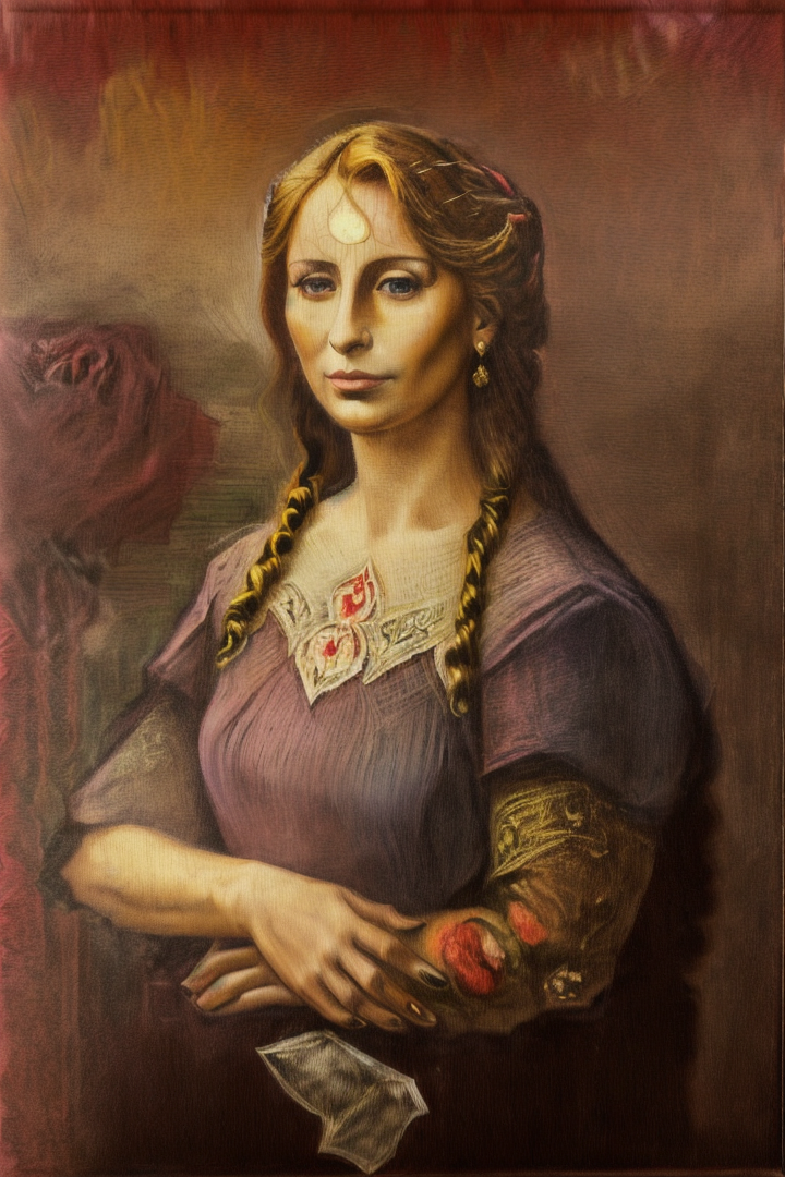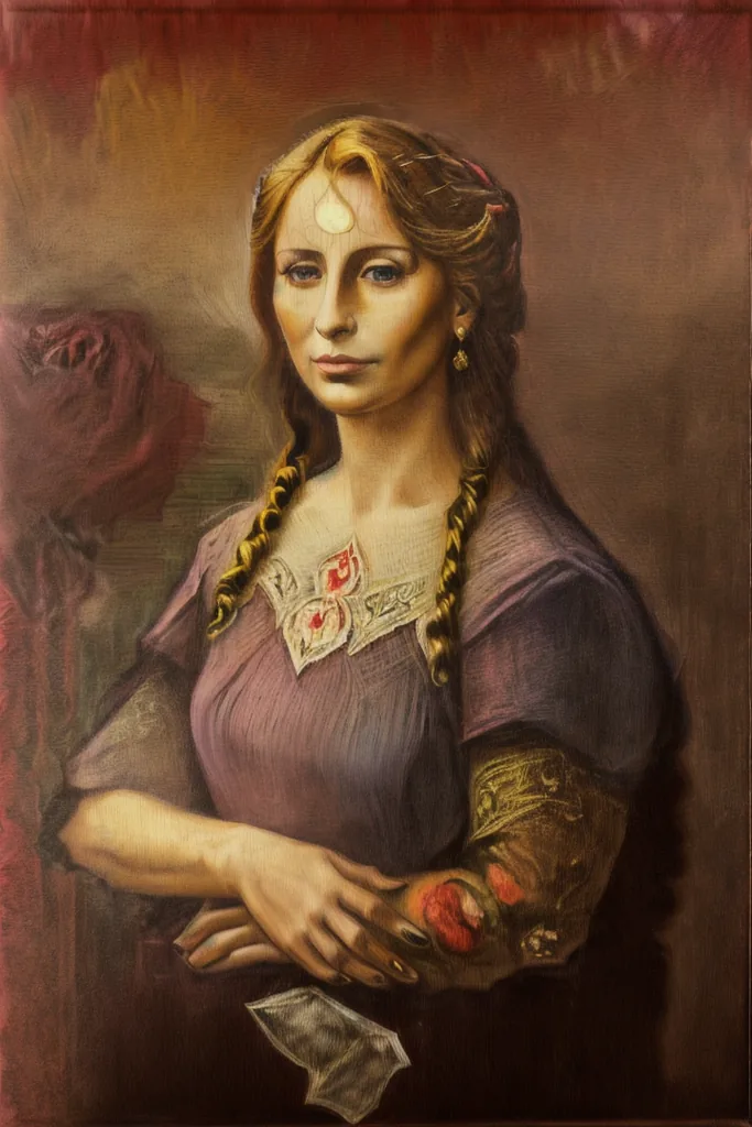 “colorful painting of a blonde gioconda, oil on canvas, red, white, garden background, grass, outdoors, roses, lilies, de la carcova”