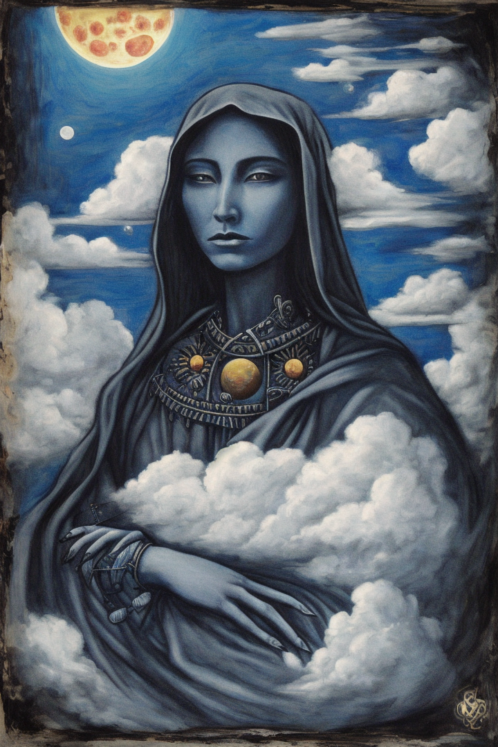 “xul solar, no humans, woman, surreal, abstract, moon, zodiac, parody, clouds”