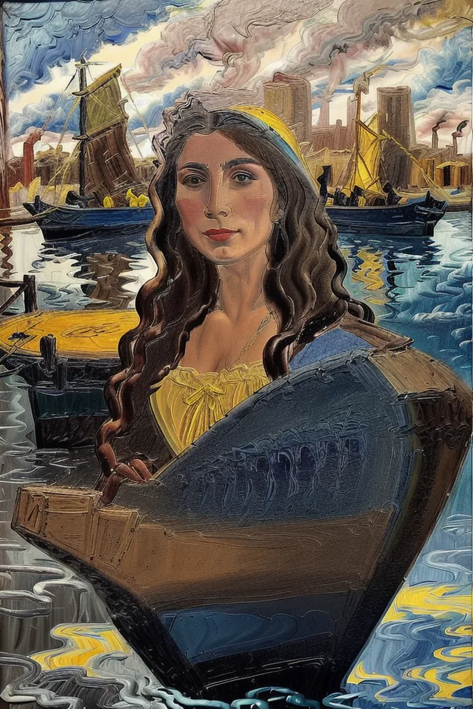 “a blue and yellow boat, portrait of a la gioconda, quinquela, colorful, water, reflections, boca juniors club, clouds”
