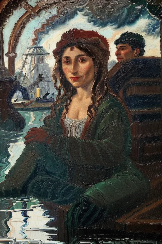 “a red, green, blue and brown day at the harboard, workers, men, portrait of a la gioconda, quinquela, colorful, water, reflections, clear sky, sun”