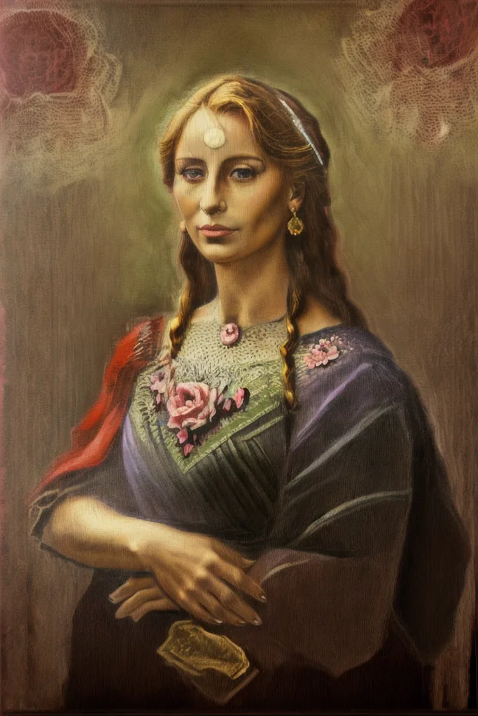 “colorful painting of a blonde gioconda, oil on canvas, red, white, garden background, grass, outdoors, roses, lilies, de la carcova”