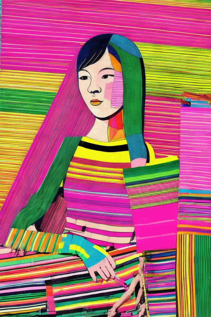 “minujin, popart, sculpture, colorfull, stripped, pink, magenta, yellow, green, a pile of colorful striped fabric sticks”