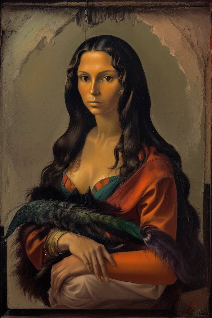 “surrealist portrait of la gioconda by fini (sfumato) (claroscuro), perspective,red, orange, green, pink, colorful, chimera, feathers, water, sexy, curly hair”