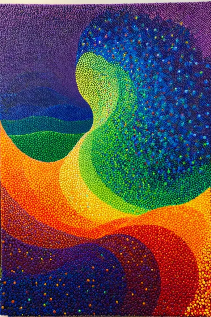 “la gioconda, ((wave)) made of rainbow colored particles of light Le Parc abstraccion geometrica green, blue, pointillism, puntillismo, rainbow, red, orange, yellow, purple, violet, particles, puntos, points (detailled) ((masterpiece)), (top quality)”