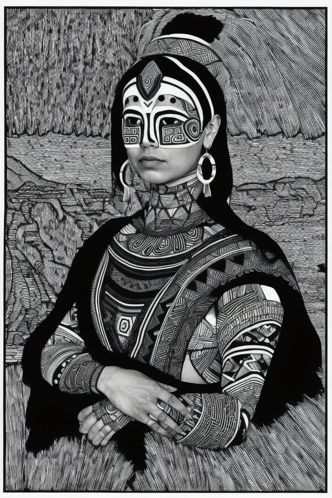 “diseño, indigena, argentino, cienaga monochrome, comic, greyscale, no humans, black background, black border”