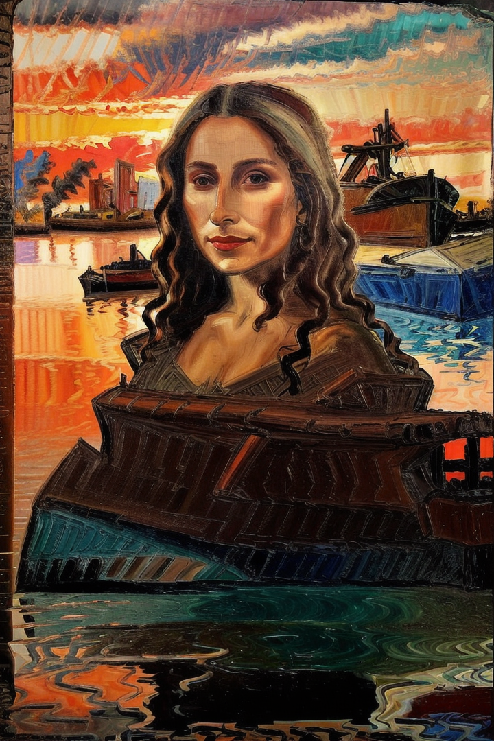 “a red and orange sunset in the ship graveyard, portrait of a la gioconda, quinquela, colorful, water, reflections, old broken ship, clouds”