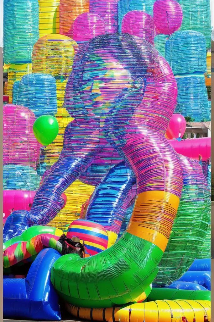 “minujin, popart, balloon instalation, stripped, colorful, woman balloon sculpture, a colorful inflatable slide in a yard, city park background”