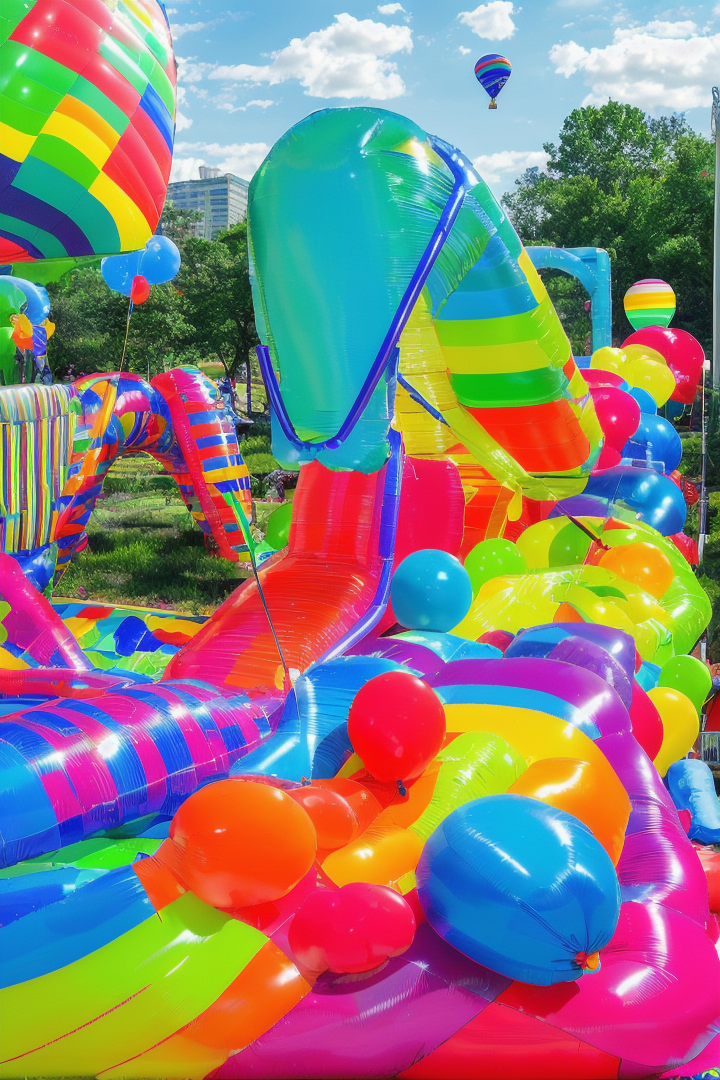 “minujin, popart, balloon instalation, stripped, colorful, woman balloon sculpture, a colorful inflatable slide in a yard, city park background”