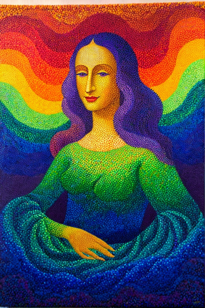 “la gioconda, ((wave)) made of rainbow colored particles of light Le Parc abstraccion geometrica green, blue, pointillism, puntillismo, rainbow, red, orange, yellow, purple, violet, particles, puntos, points (detailled) ((masterpiece)), (top quality)”