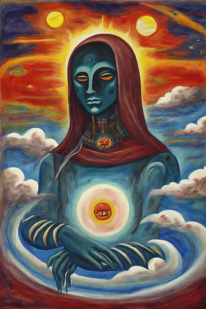 “xul solar, painting, no humans, traditional media, creature, surreal, abstract, sun, zodiac, parody, clouds, sky”