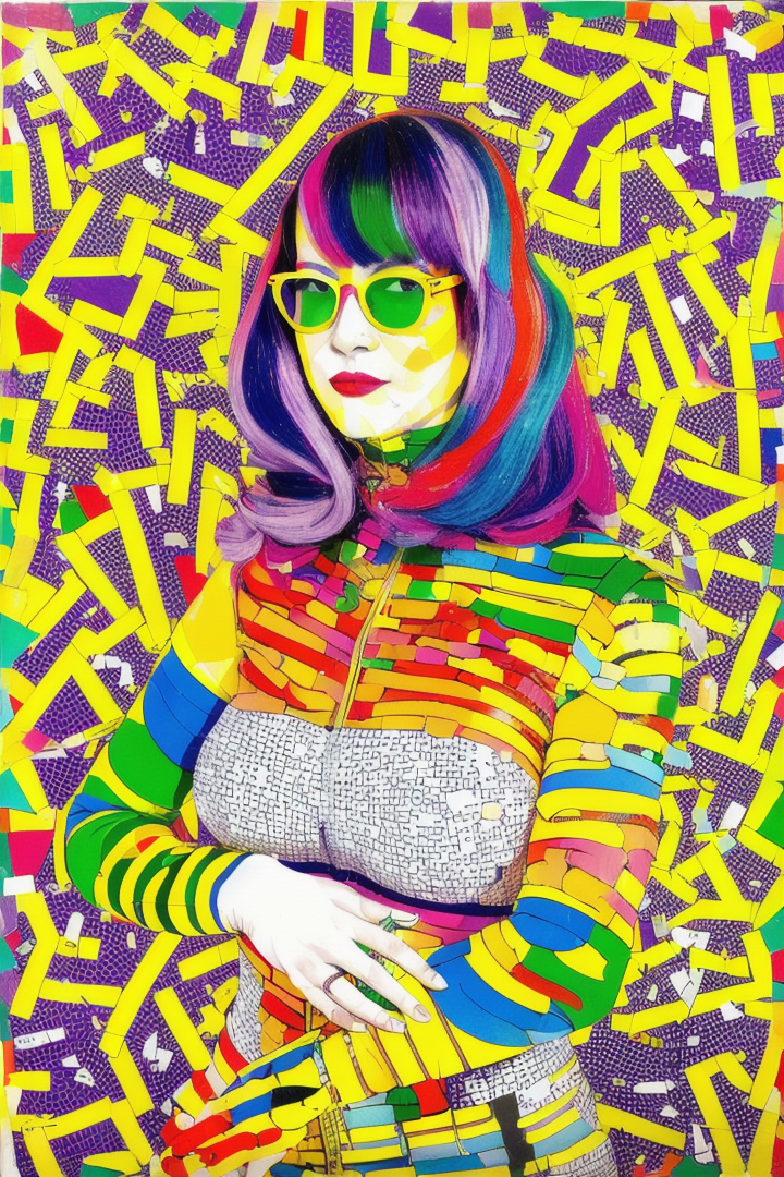 “(minujin), (popart), artwork, colorfull, (confetti stripped), yellow, purple, green, orange, portrait of a woman in a bright catsuit and glasses, white background”