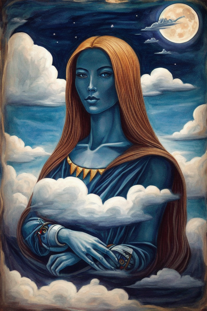 “xul solar, no humans, woman, surreal, abstract, moon, zodiac, parody, clouds”