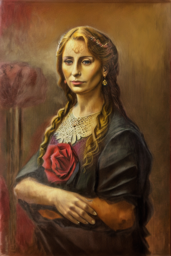 “colorful painting of a blonde gioconda, oil on canvas, red, white, garden background, grass, outdoors, roses, lilies, de la carcova”