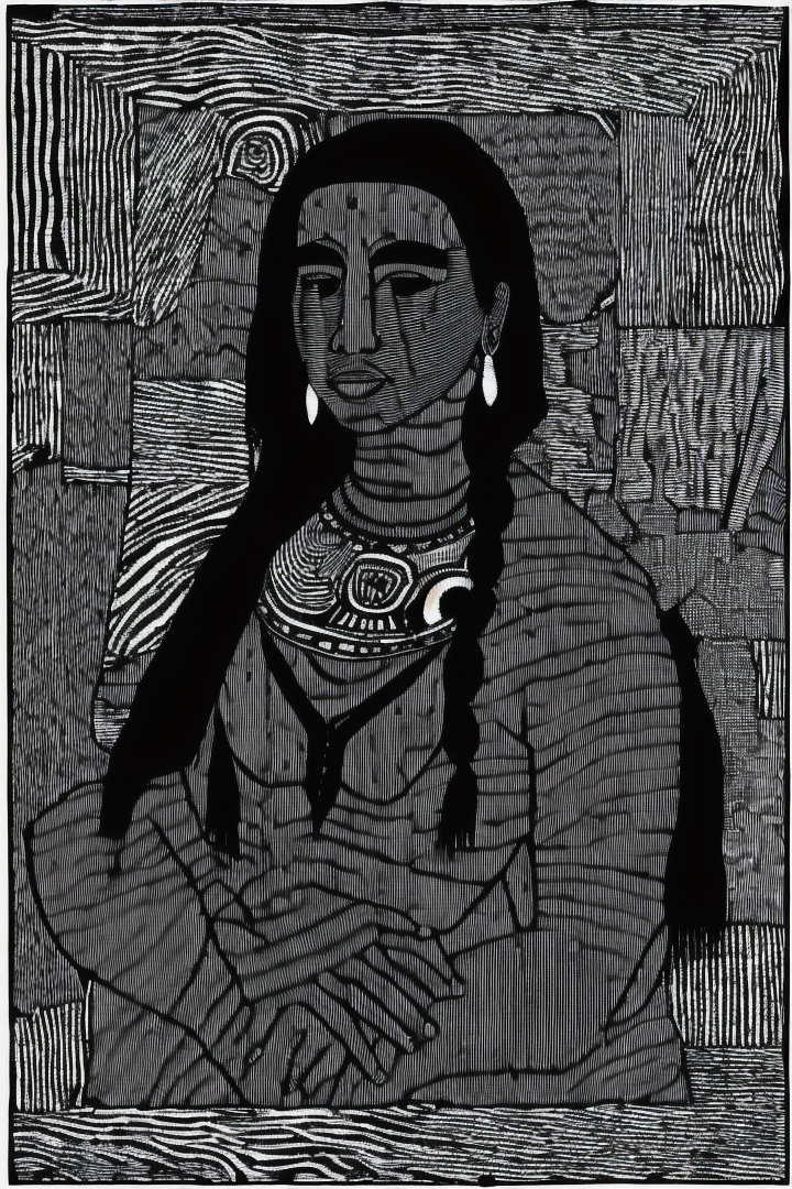 “diseño, indigena, argentino, cienaga monochrome, comic, greyscale, no humans, black background, black border”