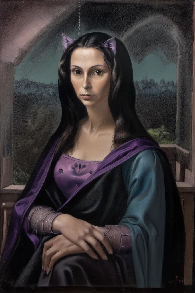 “surrealist portrait of la gioconda by fini (sfumato) (claroscuro), perspective,blue, purple green, pink, colorful, chimera, cats, catwoman, furry, water, sexy, curly hair”