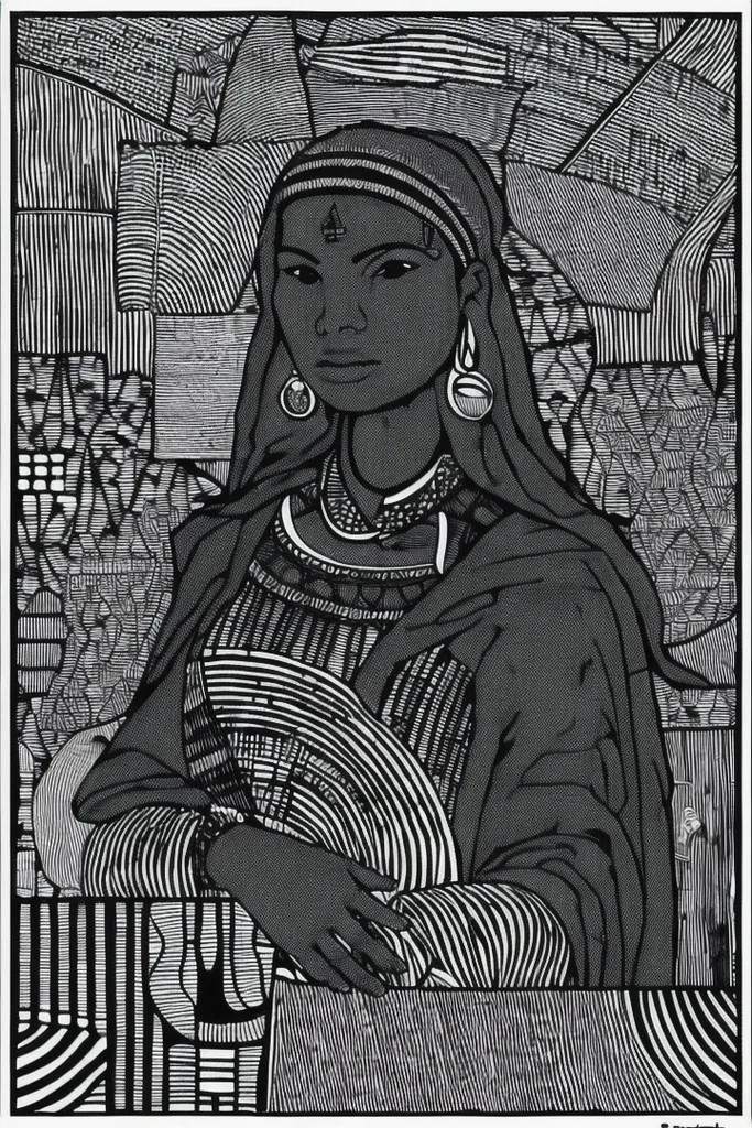 “diseño, indigena, argentino, cienaga monochrome, comic, greyscale, no humans, black background, black border”