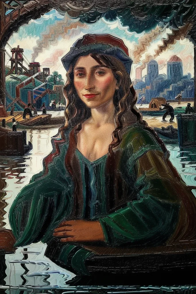 “a red, green, blue and brown day at the harboard, workers, men, portrait of a la gioconda, quinquela, colorful, water, reflections, clear sky, sun”