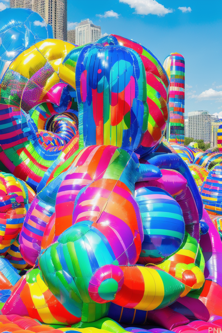 “minujin, popart, balloon instalation, stripped, colorful, woman balloon sculpture, a colorful inflatable slide in a yard, city park background”