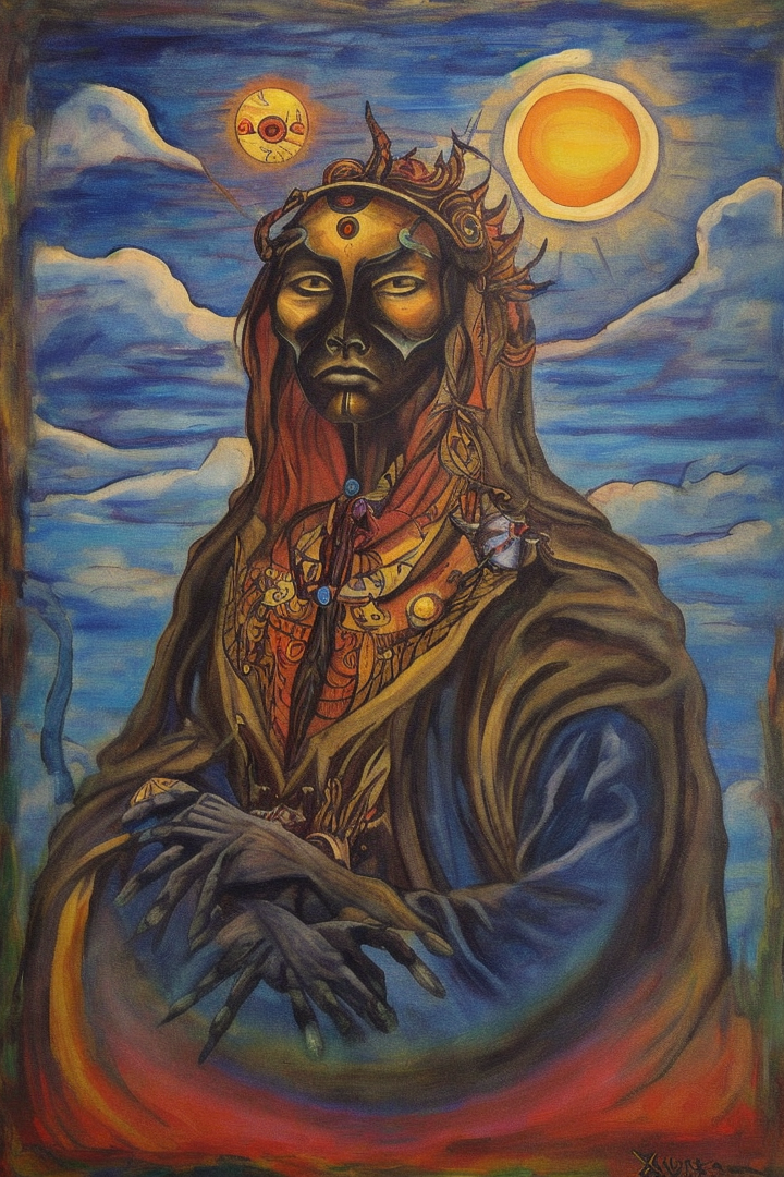 “xul solar, painting, no humans, traditional media, creature, surreal, abstract, sun, zodiac, parody, clouds, sky”