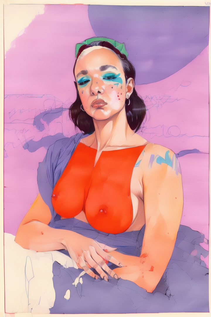 “(noma:1.8),(artwork) hand drawn pencil sketch,(lineart),outline,(expressive),sexy (nsfw),argentina,gouache,orange purple,,”
