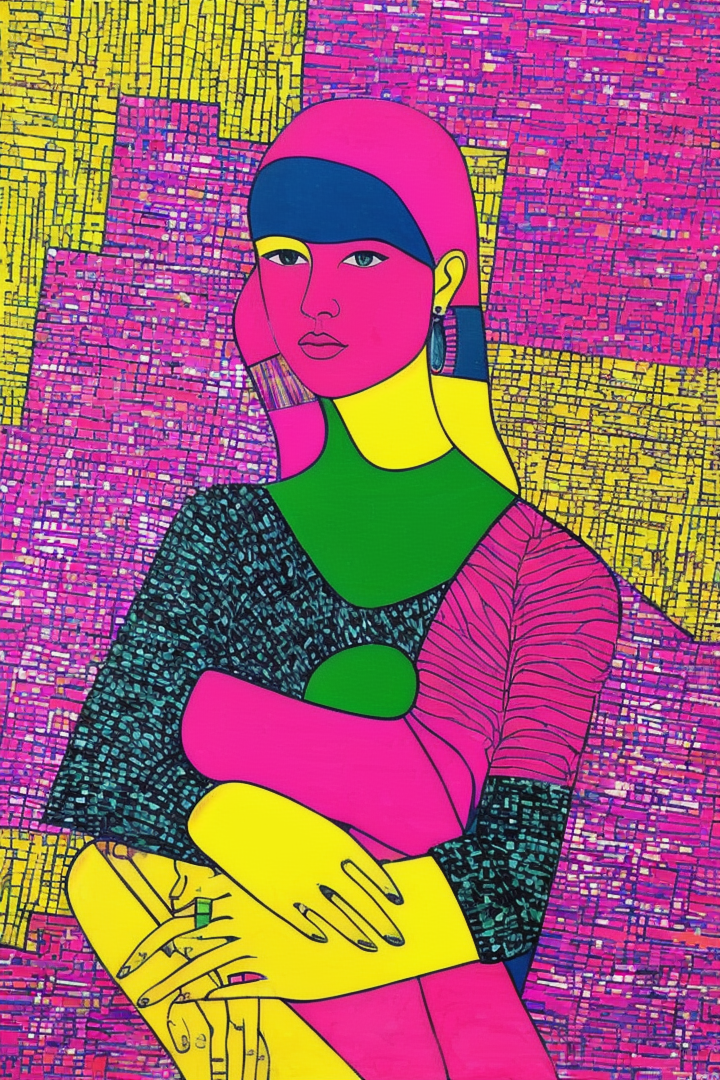 “(minujin), (popart), (artwork), (colorful) abstract portrait of a woman, colorful, stripped, pink, magenta, yellow, green, a colorful abstract painting of a large number of squares”