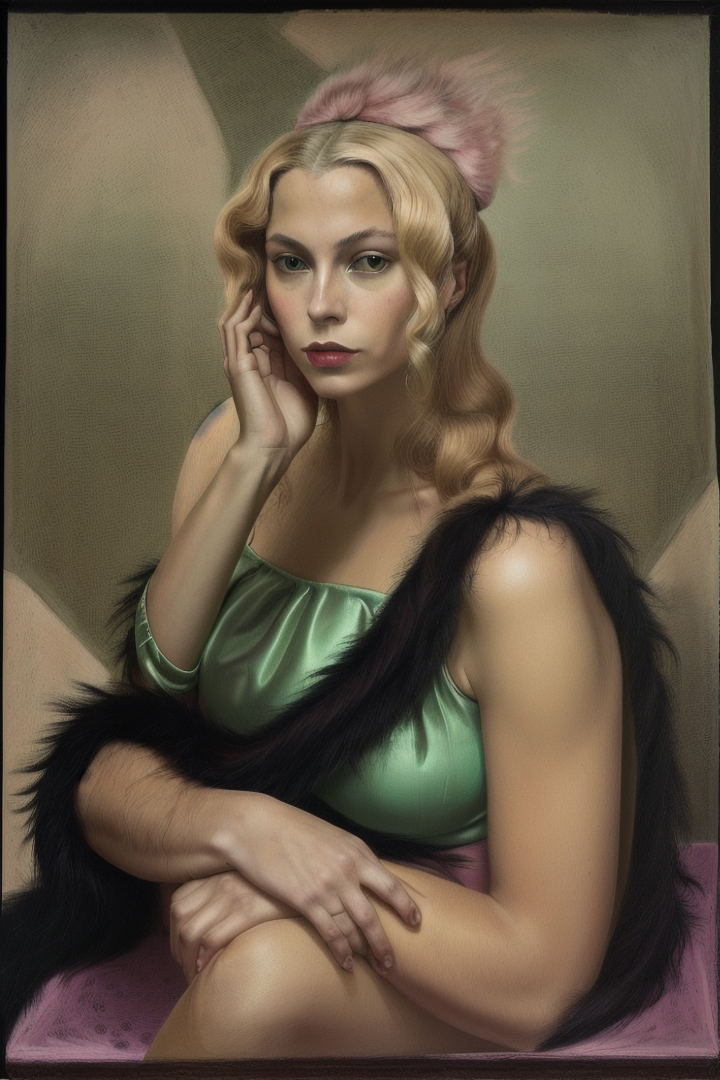 “surrealist portrait of blonde female chimera by fini (sfumato) (claroscuro), perspective,green, pink, colorful, chimera, catwoman, furry, water, sexy, curly hair”