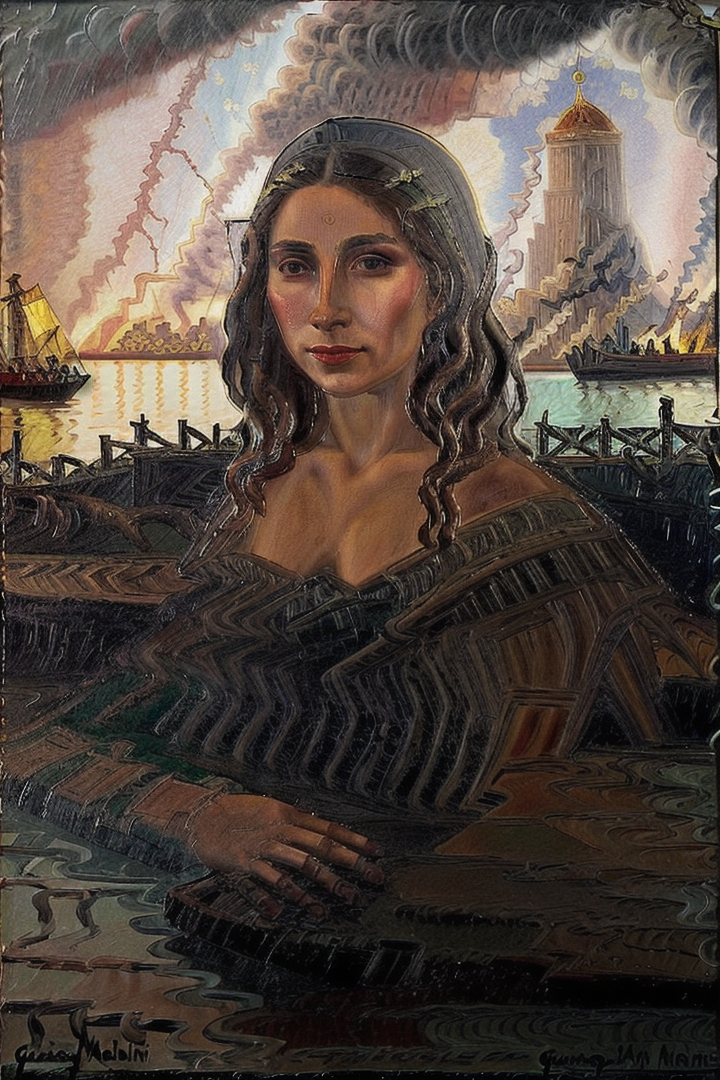 “la gioconda, quinquela, colorfull, portrait, water, reflections, buenos aires, harbour, stars, lightning, sun, moon, fire, night, day”