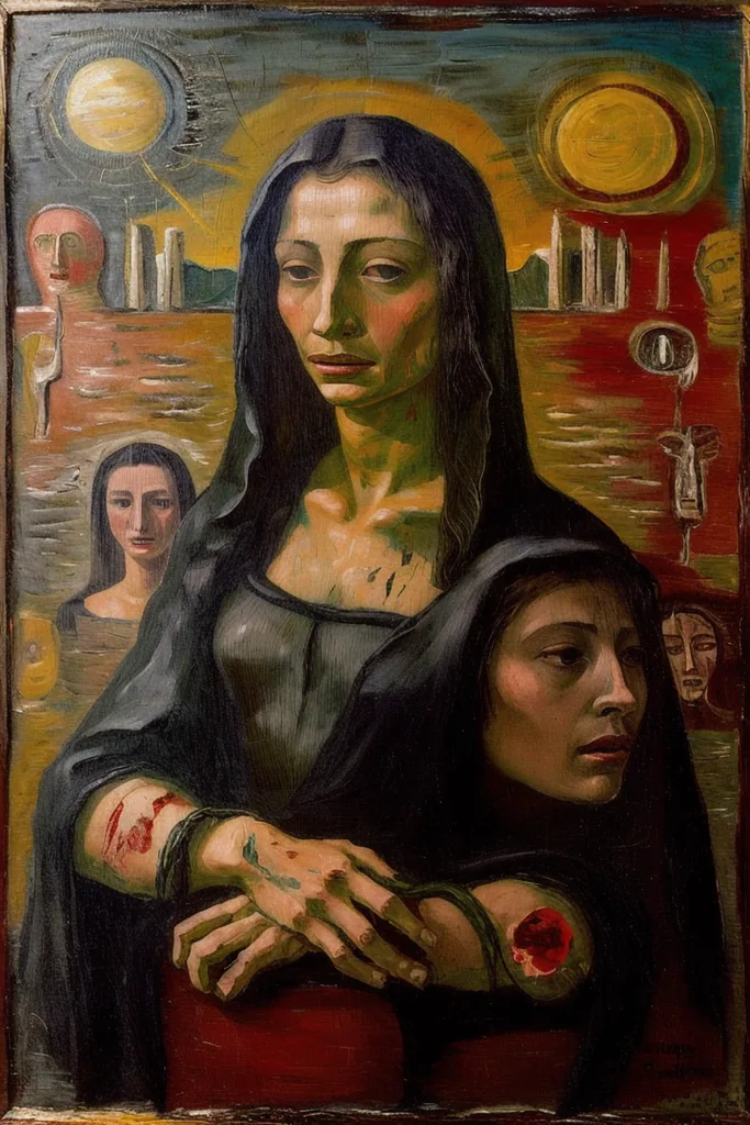 “surreal abstract portrait of la gioconda, crucified, hell, horror, forner, hellish landscape, blood, colorful”