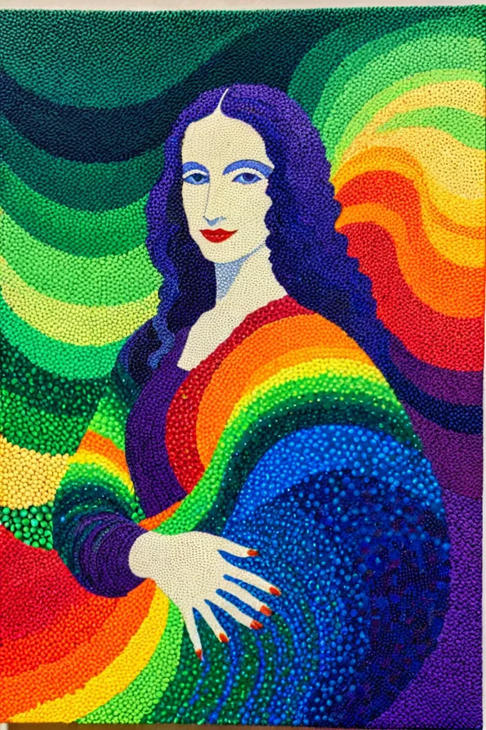 “la gioconda, ((wave)) made of rainbow colored particles of light Le Parc abstraccion geometrica green, blue, pointillism, puntillismo, rainbow, red, orange, yellow, purple, violet, particles, puntos, points (detailled) ((masterpiece)), (top quality)”