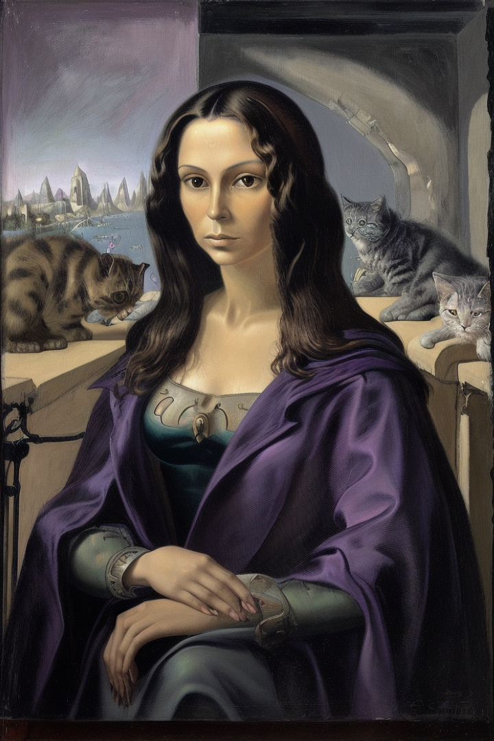 “surrealist portrait of la gioconda by fini (sfumato) (claroscuro), perspective,blue, purple green, pink, colorful, chimera, cats, catwoman, furry, water, sexy, curly hair”