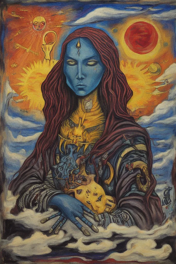 “xul solar, painting, no humans, traditional media, creature, surreal, abstract, sun, zodiac, parody, clouds, sky”