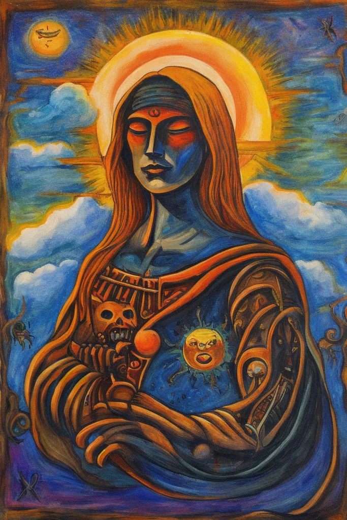 “xul solar, painting, no humans, traditional media, creature, surreal, abstract, sun, zodiac, parody, clouds, sky”