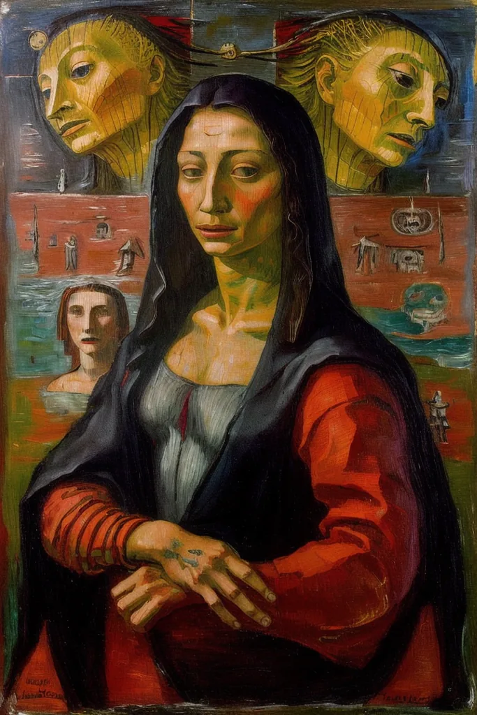 “surreal abstract portrait of la gioconda, crucified, hell, horror, forner, hellish landscape, blood, colorful”