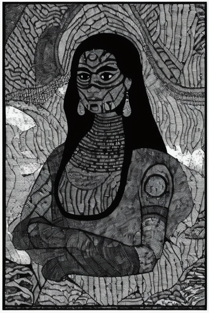 “diseño, indigena, argentino, cienaga monochrome, comic, greyscale, no humans, black background, black border”