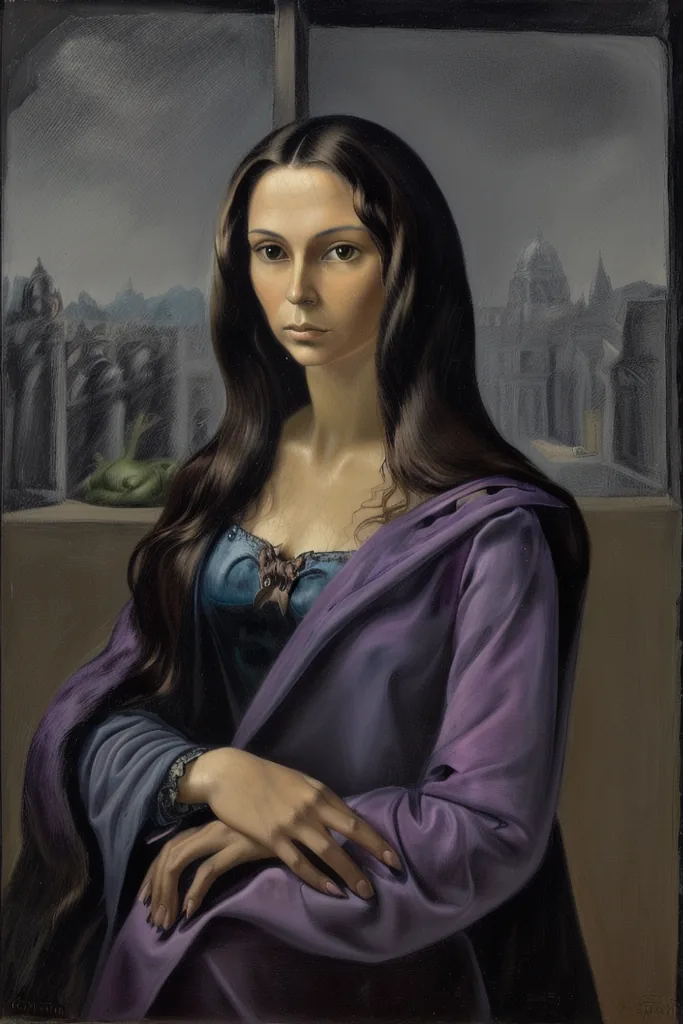 “surrealist portrait of la gioconda by fini (sfumato) (claroscuro), perspective,blue, purple green, pink, colorful, chimera, cats, catwoman, furry, water, sexy, curly hair”