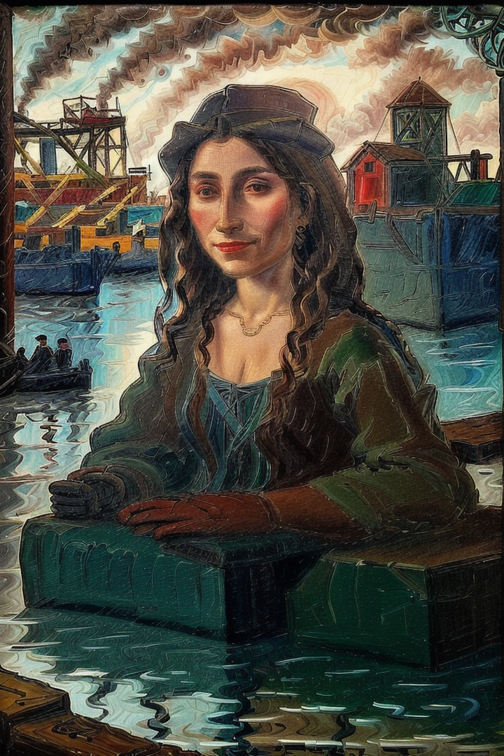 “a red, green, blue and brown day at the harboard, workers, men, portrait of a la gioconda, quinquela, colorful, water, reflections, clear sky, sun”